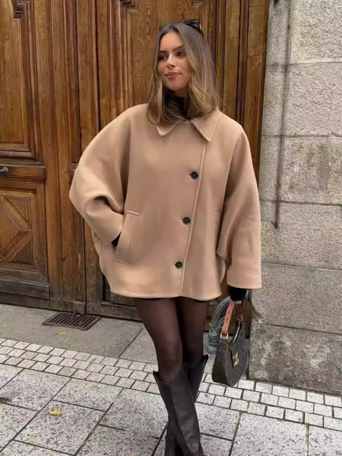 Dieser Mantel ist dein neues Statement für mühelose Eleganz! Der London Coat kombiniert den klaren, minimalistischen Look eines kurzen Mantels mit einer aufregend voluminösen Silhouette. Die ausgestellte A-Linien-Form und die weiten Ärmel schaffen eine moderne Optik. Der klassische Kragen und die schlichten Knöpfe halten den Fokus auf den luxuriösen Fall des Materials. Der London Coat ist dein Kleidungsstück für den sofortigen High-Fashion-Look.