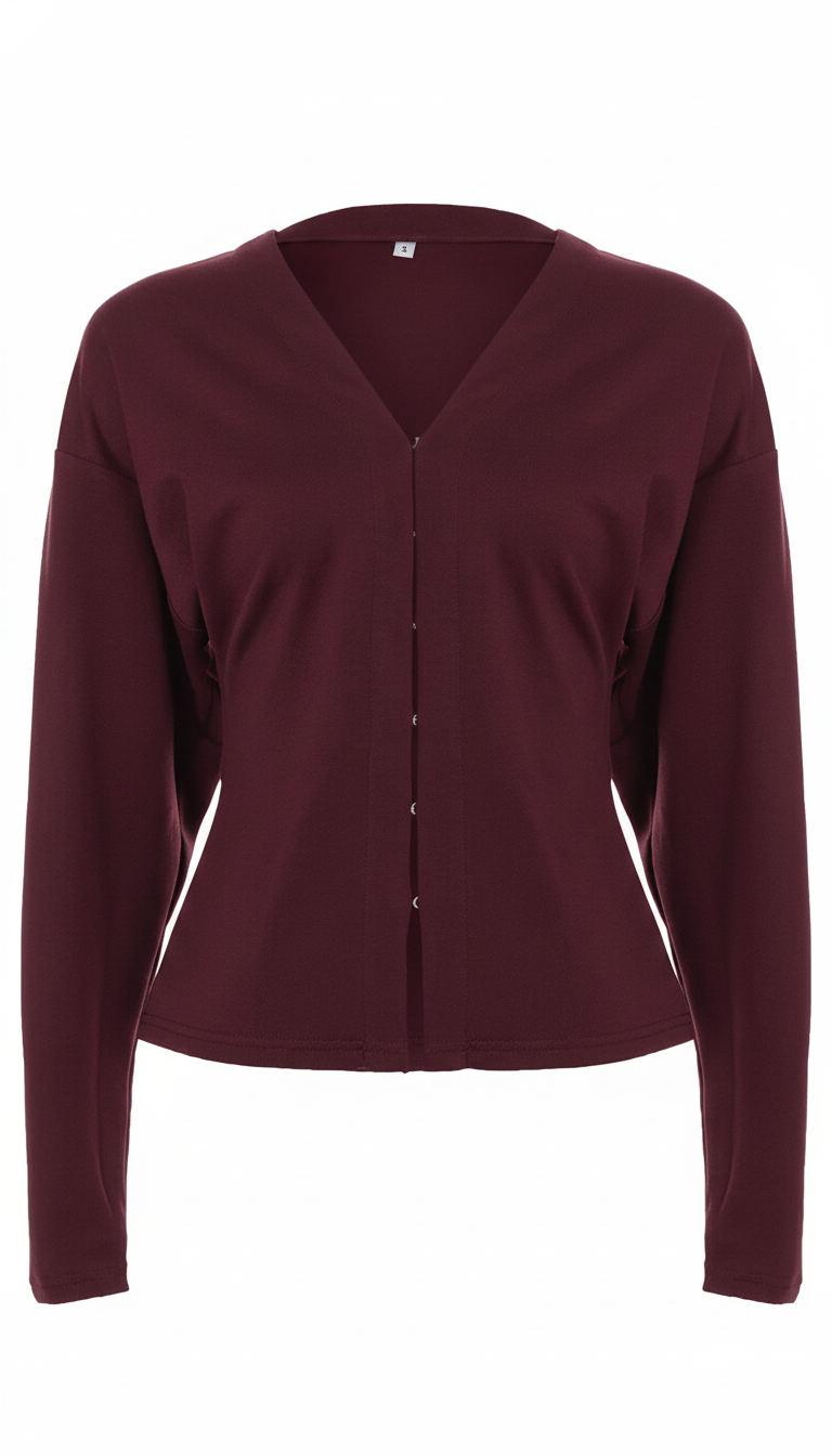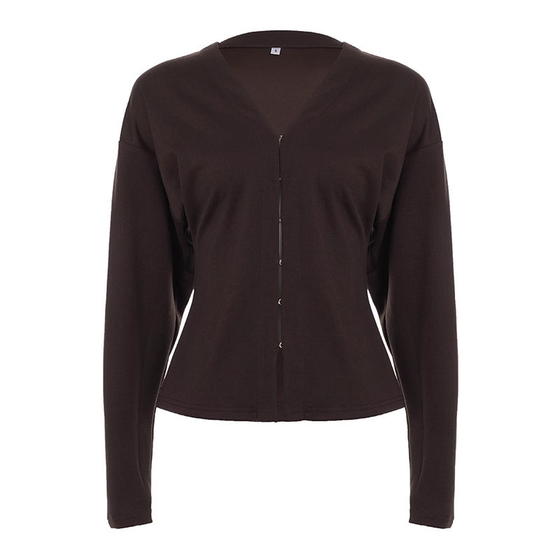 - Top-Details: Tailliertes Oberteil mit tiefem V-Ausschnitt und dezenten Haken- und Ösen-Verschlüssen.